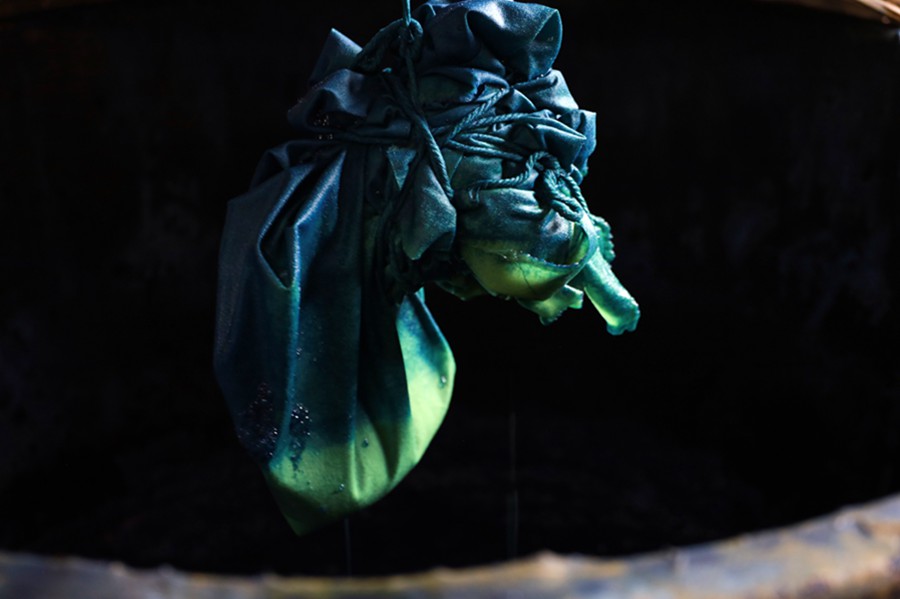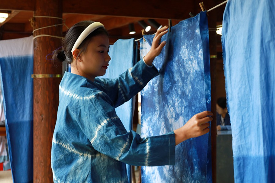 “我到这里上班一年多,日常工作就是制作扎染、蜡染布料和手工艺品,也常常向前来体验蓝靛染工艺的游客做讲解示范。”说话间,身着“布依蓝”服饰的陈小琴手脚麻利地将白色长布攥成一团,用线打结固定,在清水中浸湿后,就放入盛着蓝靛染料的大缸内进行染色,中途,她将布料不时提起氧化,又放下继续加深着色,不一会儿,染色就完成了。