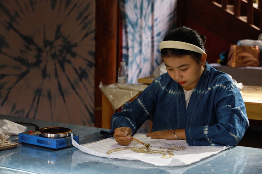 陈小琴在画蜡染